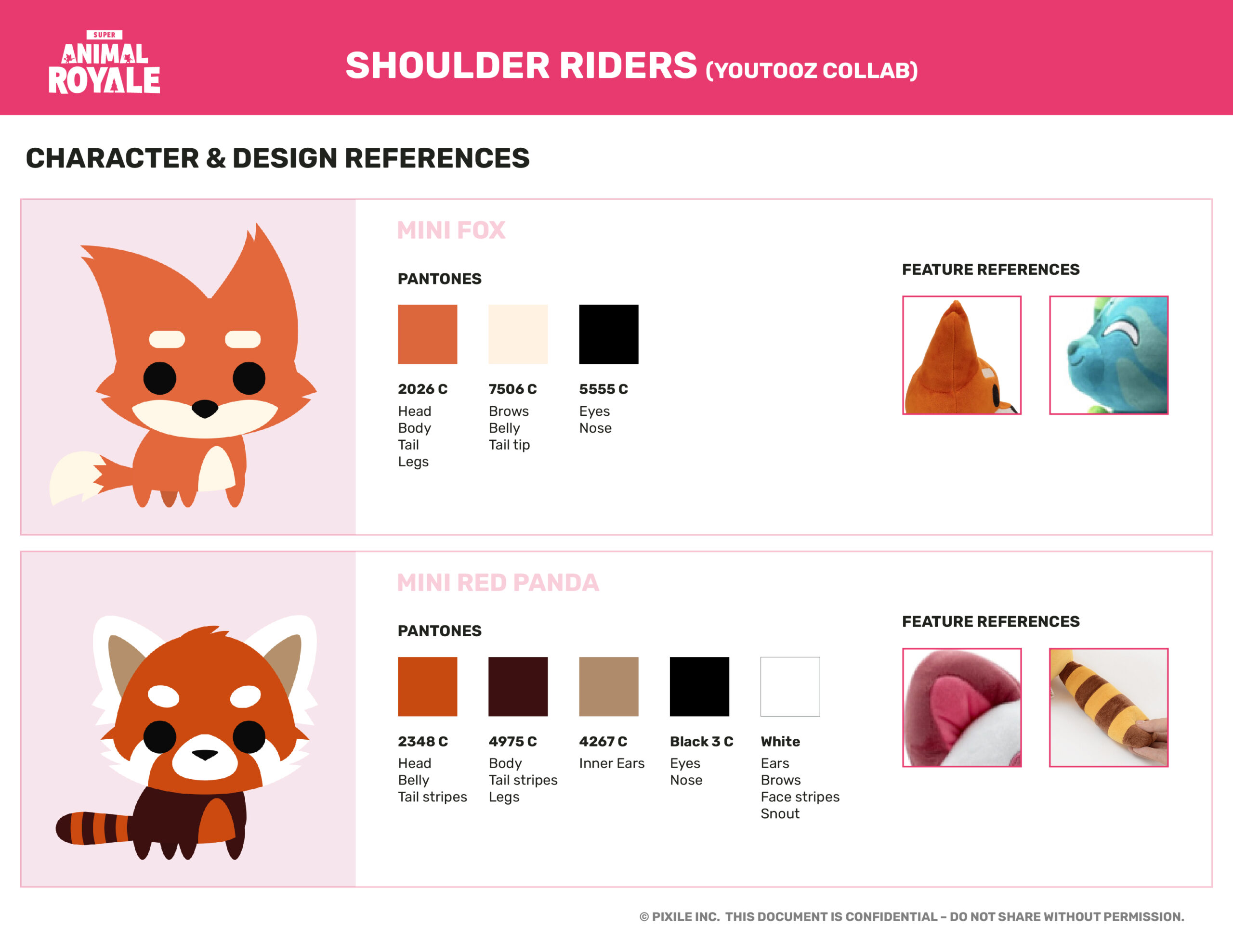 Youtooz proposed turning two of our most popular Super Animals into plushies under their 'Shoulder Rider' (magnetic) line. I worked with the Youtooz team directly to ensure we retain as much of our Super Animals' shapes and silhouettes as possible since their classic circular eyes will be replaced with the Youtooz grinning eyes, providing detailed notes and instructions for revisions on each prototype until we arrived at the final product.